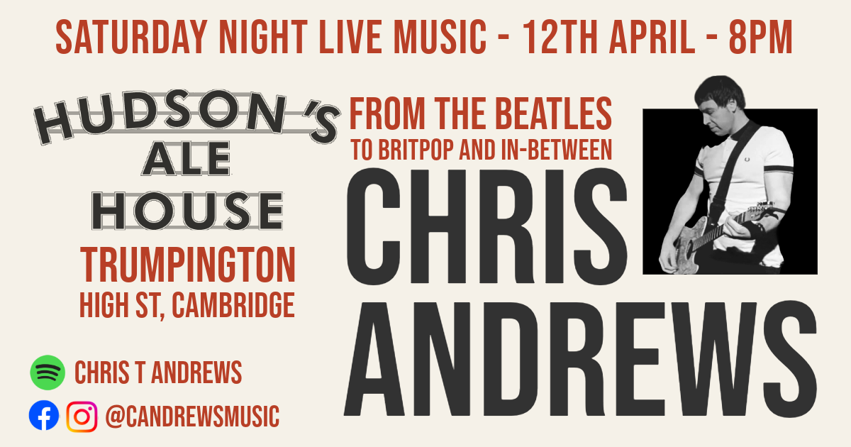 Chris Andrews (@candrewsmusic) is a Cambridge-based singer, songwriter, and producer known for his energetic performances of 90s Britpop and Indie anthems. Playing songs from the likes of The Verve, Travis, Dodgy, The Bluetones, Cast, Supergrass, and James—plus a sprinkling of others’ tip-top tunes such as The Beatles and Pink Floyd—Chris delivers a night of singalong classics with jangly guitars and strong vocal melodies.